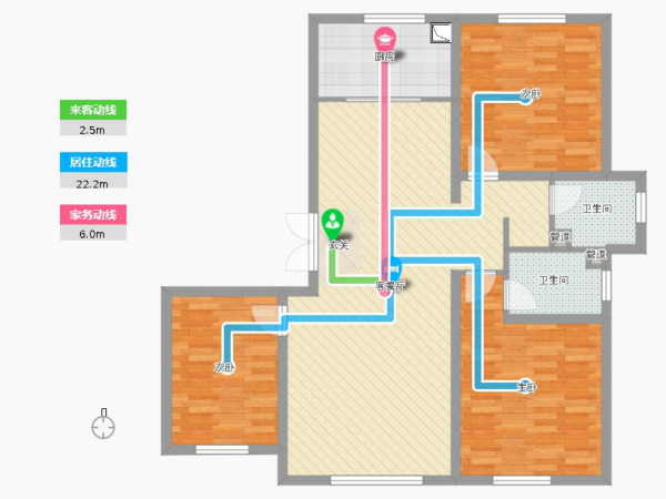 建议:室内的动静线最好不要交叉,因为动静线交叉穿越,不利于客/餐厅内家具的布置和使用,也影响了休息区的私密性和安静。深蓝色第6届“双11家装狂欢节”开启,抢先预定→