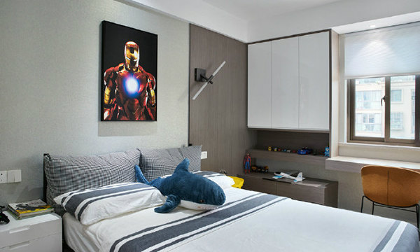 这是给孩子的房间,漫威元素比较多,给人一种强烈的沉浸感,这就是设计的高明之处:细节之处见真章。整体色调还是比较清新亮丽的,远离了都市的喧嚣和嘈杂,只剩下单纯的睡眠空间。深蓝色装饰全年最大一次优惠活动,抢先预定→