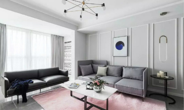 墙面刷了白色乳胶漆,大面积的白色能够使空间更加宽敞。但是很多人会认为白色过于单调,毫无设计感,会让生活品质下降。其实不然,白色属于硬装的一部分,需要用软装用来装饰。设计师取消了复杂的沙发背景墙,而改用竖线条拉伸空间的高度。粉色地毯为整个客厅贴上了清新、时尚的“标签”。预约活动拿万元装修基金,戳这里报名→