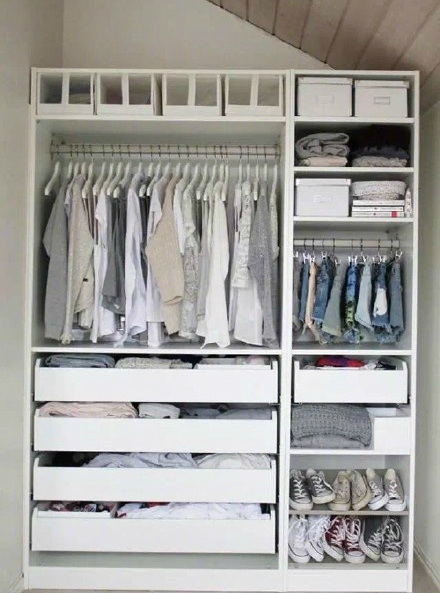 注意:层板之间相隔的距离不要太大,否则叠放的衣物太高,底部的衣物就很难取出来了。层板和抽屉可以选择能完全拉出的款式,这样最深处存放的东西就能欧轻松取放。