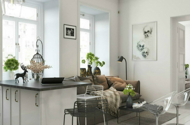 拥有后现代主义特色的北欧风在这个不大的空间中展现了不一样的效果。李女士说,这样的客厅才是我最喜欢的,简单的一排可以让人昏昏欲睡又能阅读的沙发,又加入了一盏台灯,这样的构造足够了。李女士很喜欢养花,所以客餐厅区域必不可少的需要花草的点缀,而且要求设计师配上几个可以放书的架子和几幅挂画。
