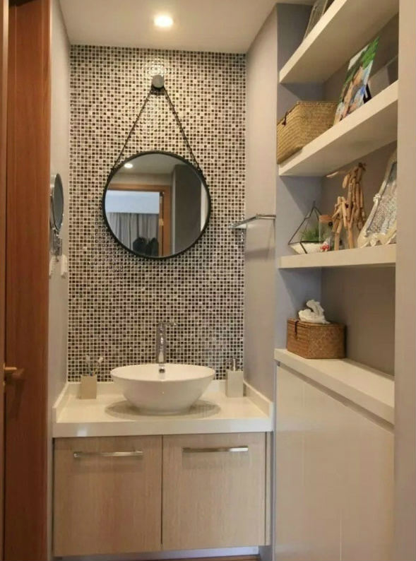 洗手台区域比较小。但在拥挤的环境当中才能凸显设计师的设计水平。圆形的掉镜加上小方砖,颇有种在地中海风格的感觉。右边则是储物搁架,放一些平常用的东西。唯一让本人不满意的是居然设计了个台上盆,真的是多此一举,当时还没发现,事后才发现很不好打理。戳这里,立即免费领取一份全套效果图→
