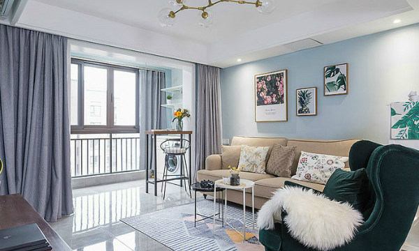 北欧风讲求的就是简单实用,注重功能新,所以吊顶只是走了一圈简单的石膏板,像这种简约灯具也比较常见。地面铺了亮面的瓷砖,正好与墙面颜色统一。沙发增加了舒适感。戳这里,立即咨询详细信息→