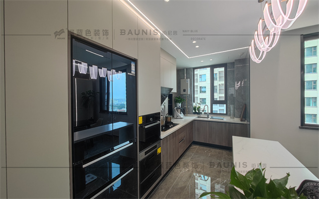 厨房功能齐全,橱柜的色调是浅灰色,低调耐脏,L型布局使得厨房利用空间更大,开放式设计使空间更加通透。独特吊灯,显得房间前卫时尚。