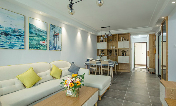 客餐厅比较通透,采光充足,制作了一圈简单的跌级吊顶,这里要注意的是筒灯的间距要保持在五十公分左右,这样光线能够均匀的洒在墙面上。原木色和灰色地砖进行搭配,也比较符合北欧风的特点。并不是越多的装饰越能体现简约和温馨的生活。深蓝色装饰全年最大一次优惠活动,抢先预定→