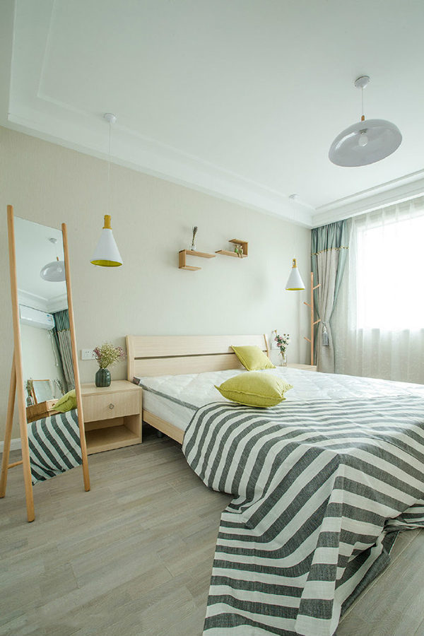 主卧原木色的所占的比例就更加多了,落地镜、床头柜、床体、吊灯、搁板等等都采用原木色的材质,但这里要注意一下,原木并不代表实木哦。主卧线条感流畅,基本做到了一气呵成。偏灰色系的木地板带给人柔软的脚感和舒适感。这样的主卧怎能不让人喜欢。深蓝色装饰全年最大一次优惠活动,抢先预定→