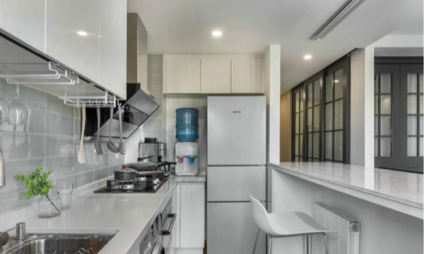 开放式厨房有时候也比较实用。同一色系的搭配整体色调基本保持一致,小型吧台也省去了放餐桌的位置,毕竟套内面积也不是很大。而且厨房本来就是用电比较多的地方,所以线盒都隐藏的很好。戳这里,立即抢定开年大促优惠名额→