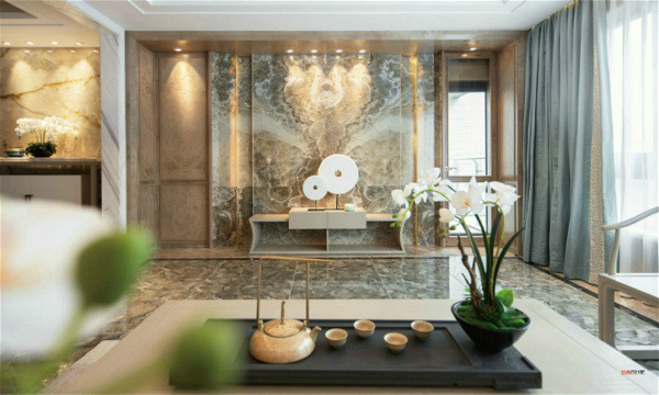 大理石背景墙,自然水纹路,光泽度非常的高。精致略带现代风格的电视柜非常的美观,尺寸也把握得非常好。左右对称的线条比较硬朗。整个客厅色调一致,住在这里就是一种别致的生活享受。双11家装钜惠提前预热,百份豪礼直送→